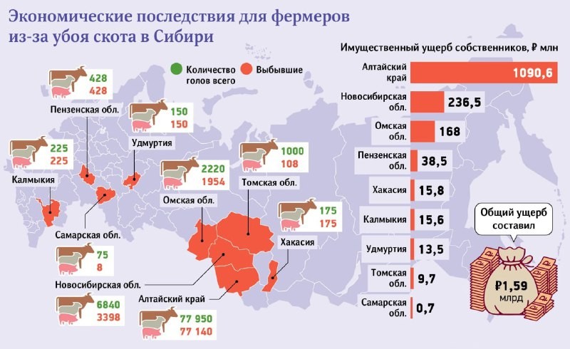 Siperian karjan joukkoteurastuksen aiheuttamat vahingot ovat ylittäneet 1,5 miljardia ruplaa. Lisäksi 368 miljoonaa ruplaa on maanviljelijöille ja yksityisille tiloille aiheutuneita tappioita, joita ei ole vakuutettu.