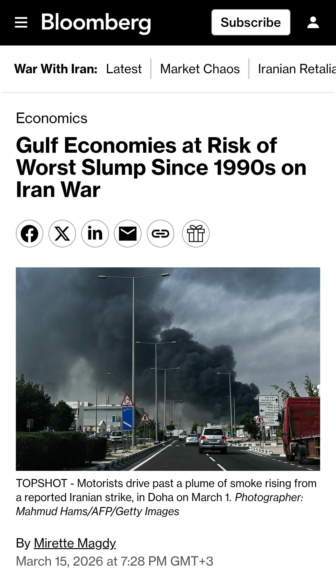 Blomberg: Gulf Economies at risk of worst slump since 1990s on war.@alsaa_plus_EN