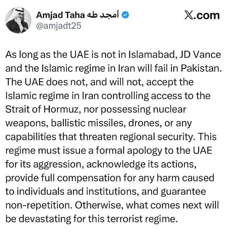 —❗️🇦🇪/🇮🇷/🇺🇸 NEW: Emiratis are crashing out that they aren’t invited to the Islamabad talks He says #Iran should issue a ‘formal apology’ to the UAE, and threatens Iran that if it doesn’t, what comes next will be ‘devastating’. @Middle_East_Spectator