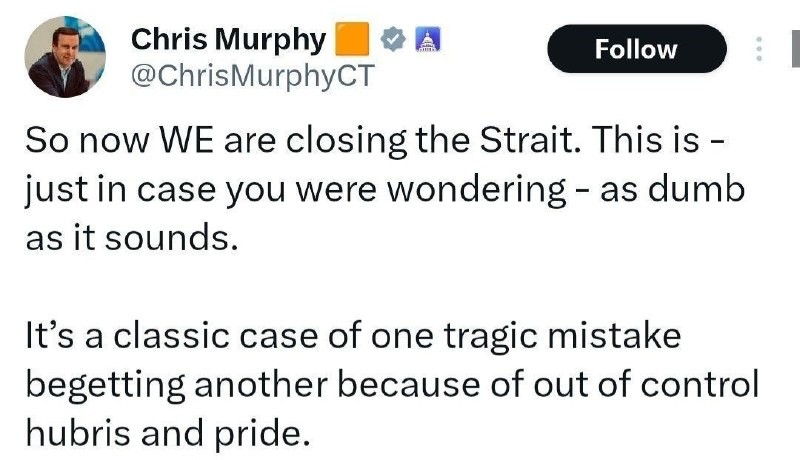 ⚡️ US Senator Chris Murphy: Trump's decision to blockade the Strait of is "foolish and full of hubris" 🔹"This is a classic case of one tragic mistake leading to another, due to out-of-control pride and arrogance."