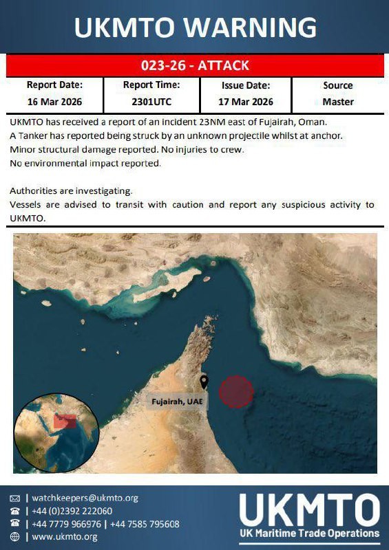UKMTO reports that a tanker has been hit and damaged east of Fujairah, United Arab Emirates.
