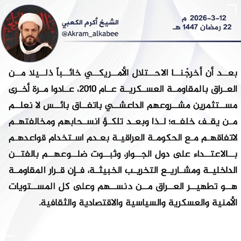 Akram al-Kaabi: We will liberate #Iraq from the presence of American occupiers Secretary-General of the Al-Nujaba Movement in Iraq: The resistance's decision is the complete liberation of Iraq from the American presence at all levels. After lea...