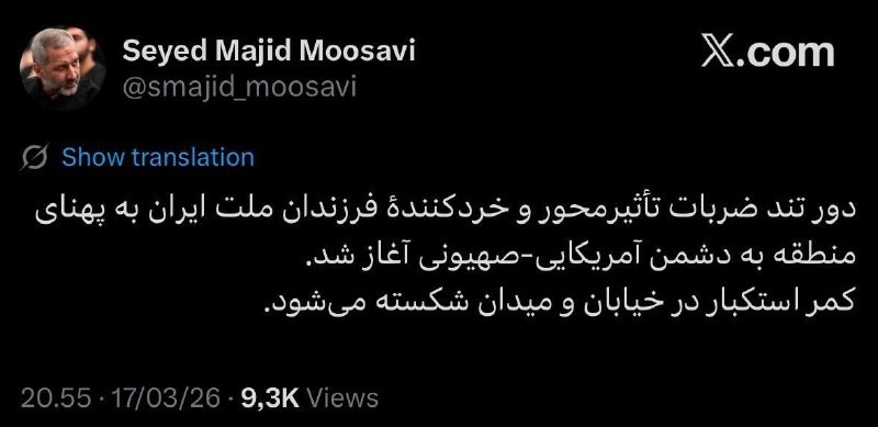 🇮🇷 “The rapid, impactful, and crushing strikes by the children of the Iranian nation across the region against the American-Zionist enemy have begun.” — Commander of the IRGC Aerospace Force, Sayyid Mousavi