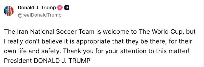 #Trump says the ‘Iran National Soccer Team’ is welcome to come to the World Cup, but he does not believe it is ‘appropriate that they be there, FOR THEIR OWN LIFE AND SAFETY’