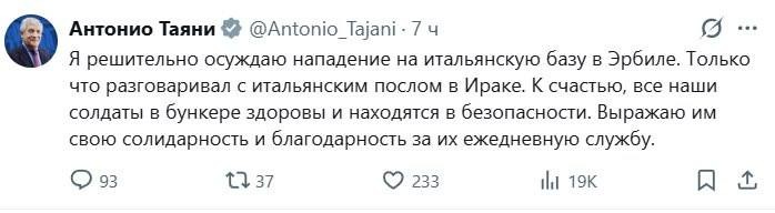 The Italian Foreign Ministry states that an Italian military base located in Iraqi Kurdistan was attacked tonight: "I strongly condemn the attack on the Italian base in Erbil. I just spoke with the Italian ambassador to #Iraq. Fortunately, all o...