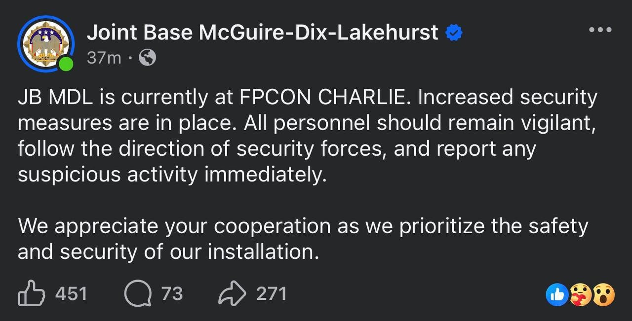 All non-military personnel have been ordered to leave Joint Base McGuire-Dix-Lakehurst in New Jersey immediately, and the base has been placed on Charlie Force Protection Mode (FPCON) following reports that "several suspicious packages