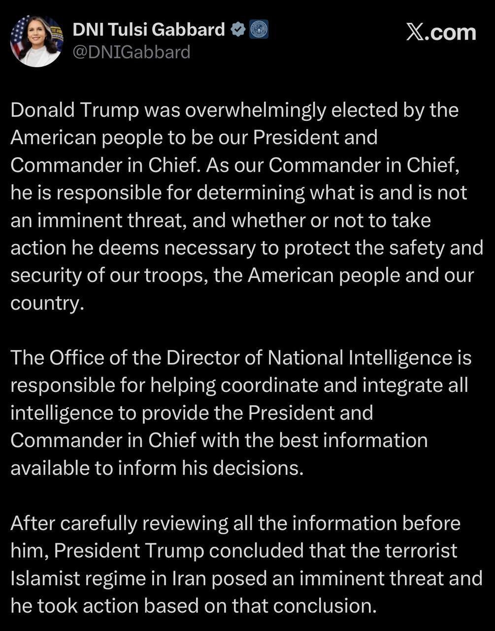 The US Director of National Intelligence, Tulsi Gabbard, said in a statement: "After carefully reviewing all the information available to him, President has concluded that the terrorist Islamist regime in poses an immediate threat