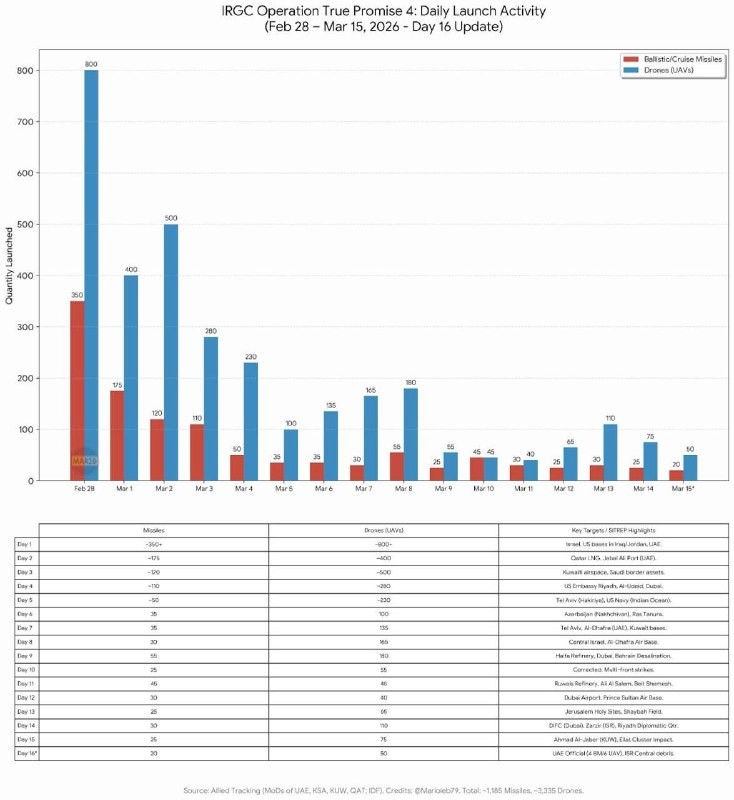 Daily recorded launches of Iranian ballistic missiles and drones. This seems to be the minimum daily requirement at the 15 day mark to achieve successful penetration of regional air defenses. 10-30 ballistic missiles 50-100 drones This doesn’t no...