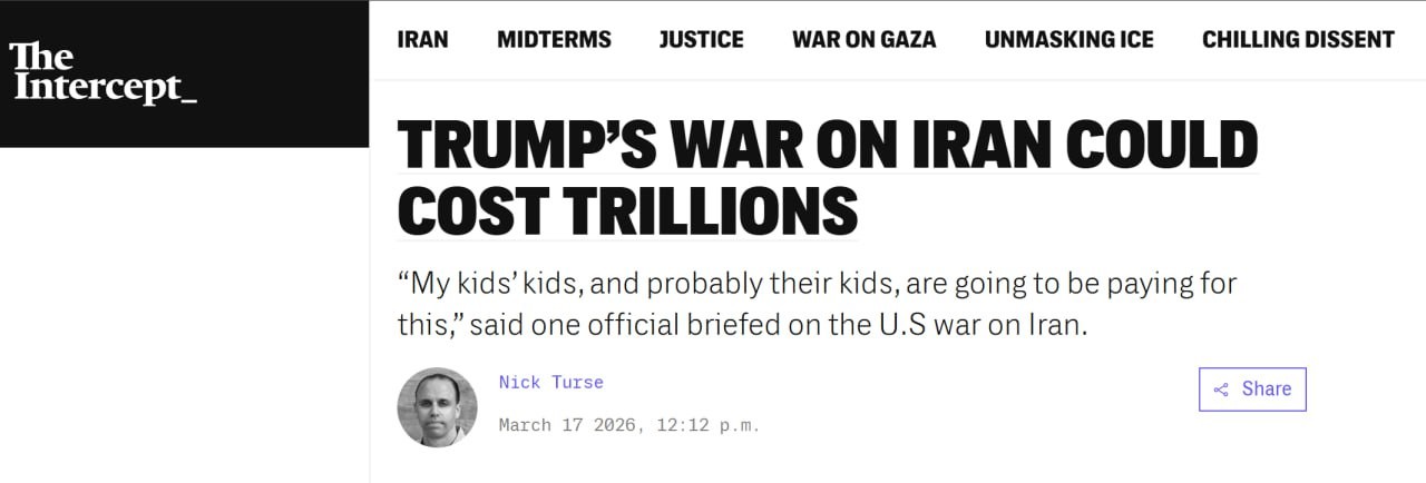 The US spending on the war with #Iran may exceed a trillion dollars, The Intercept reports, citing expert estimates and data on the dynamics of military spending. "Our children, and probably our grandchildren, will have to pay for this,