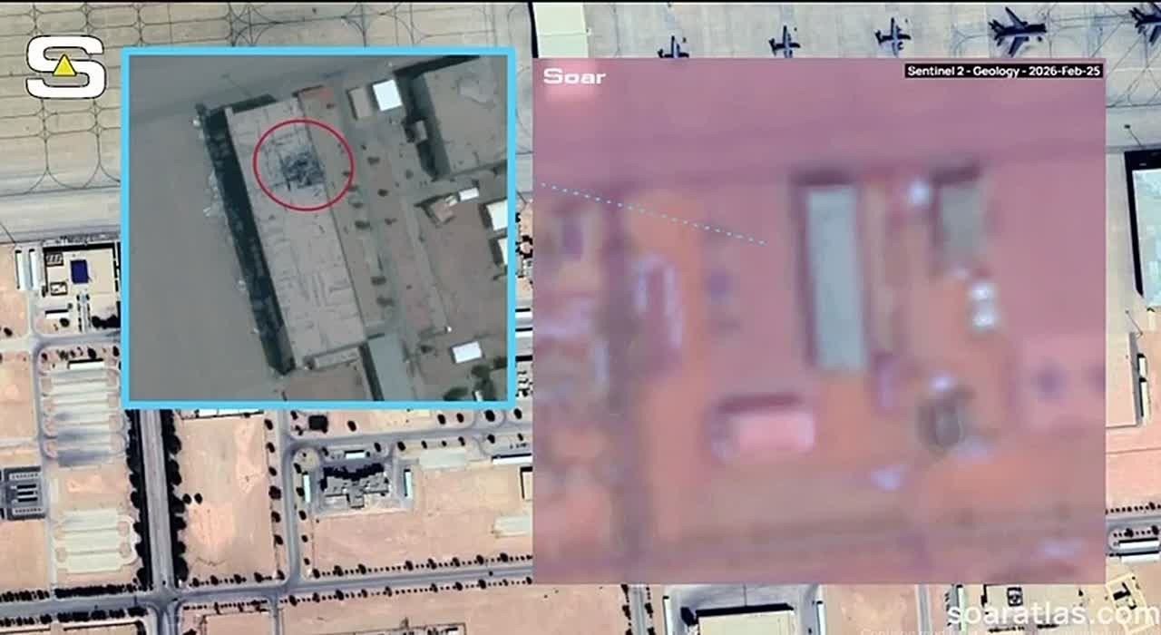 Satellite images from March 17 show a corresponding dark spot confirming a hit to a hangar on an apron used by the BBC at Prince Sultan Air Base in Saudi Arabia.