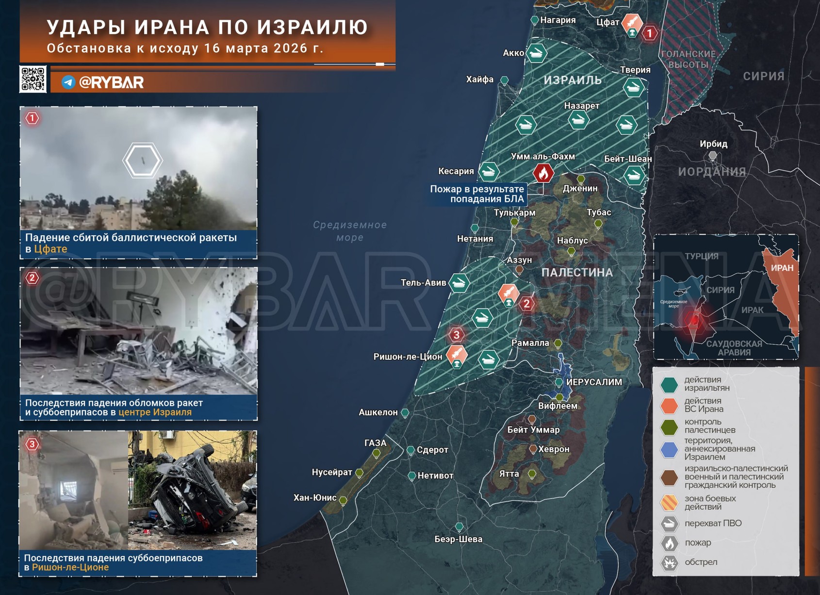 The situation in Israelby the end of March 16, 2026In the center of , air defense systems are getting closer and closer to Iranian missiles. As a result, in the vicinity of Tel Aviv, submunitions and fragments fell in at least eight places...