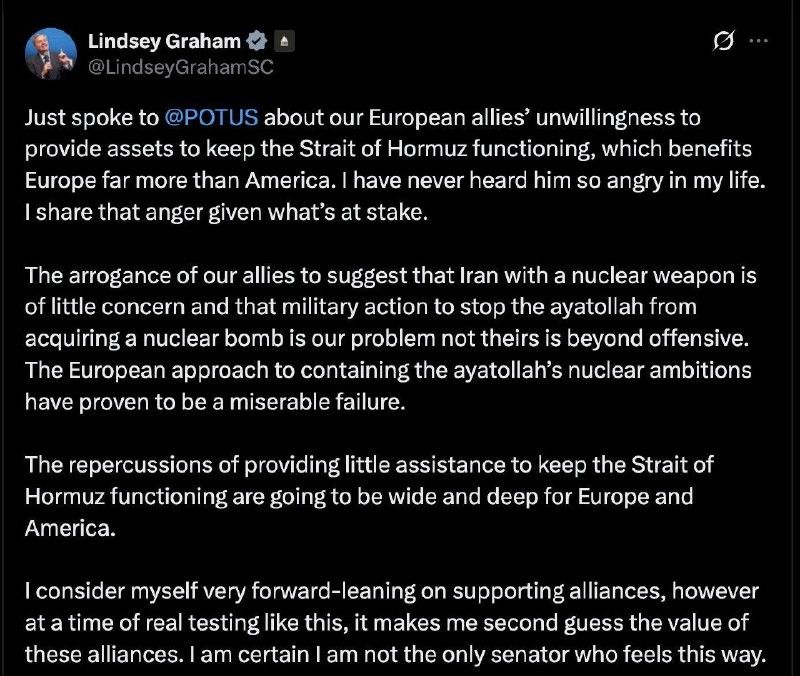 Lindsey Graham says POTUS was never angrier as European allies refused to take part in the breakthrough of the Strait of Hormuz "I share that anger given what's at stake"