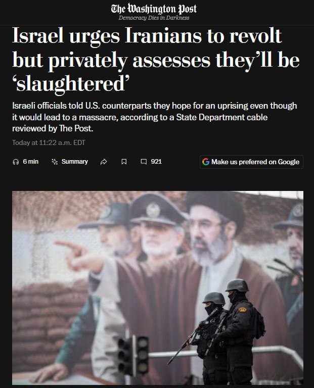 The Washington Post: #Israel is calling on Iranians for a popular uprising, but privately assesses that it could lead to bloodshed This is stated in a US State Department document reviewed by the newspaper.