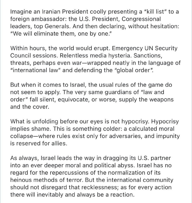 Iran's Foreign Minister Abbas Araghchi: #Israel has no regard for the repercussions of the normalization of its heinous methods of terror. But the international community should not disregard that recklessness