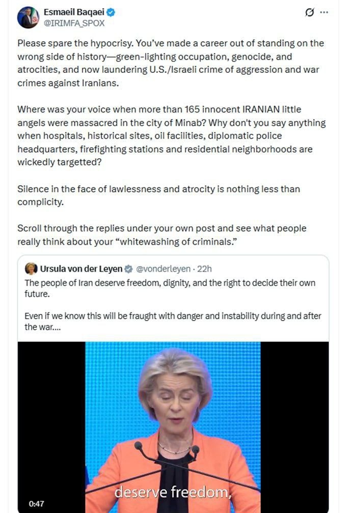 Iranian foreign ministry spokesperson harshly criticizes European Commission presidentIn a post on X Ismai Baghaei addressed #Ursula von der Leyen:You have spent a lifetime standing on the wrong side of history by giving the green light to
