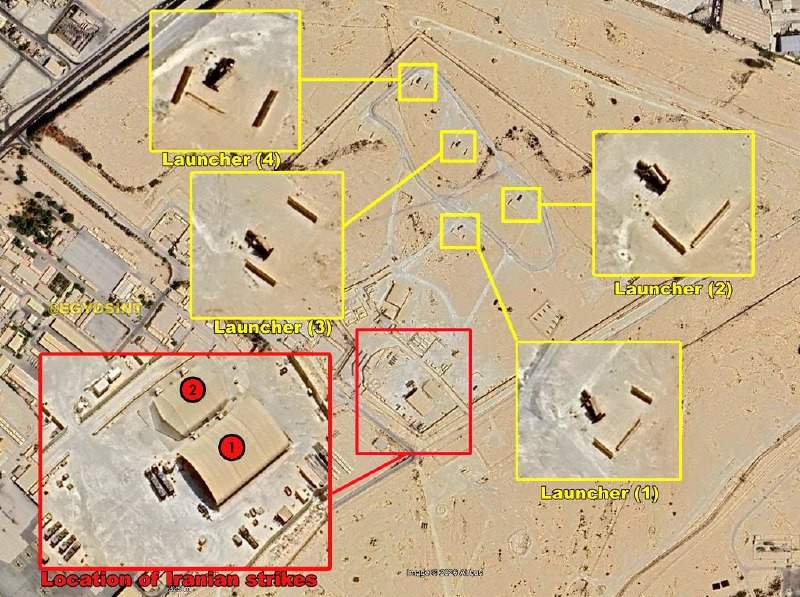 Satellite Pics of damage at the Riffa air base in Bahrain The Iranian strikes hit an MIM-104 Patriot air defense system position and two reinforced shelters