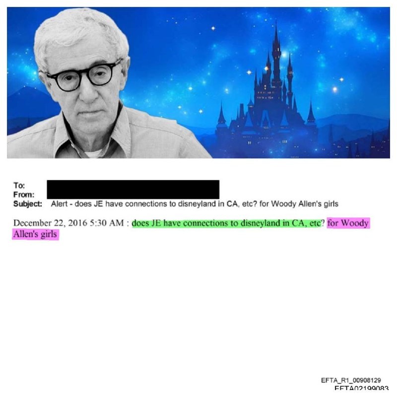 "Does have connections to DISNEYLAND in CA for Woody Allen's girls?" — Epstein files mail dated December 2016 Woody Allen is mentioned more than 7,200 times in the Epstein files Join us | @MyLordBebo