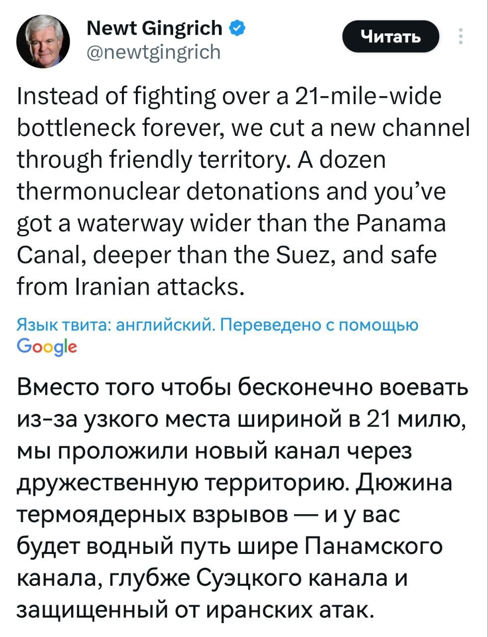 Former Speaker of the U.S. House of Representatives Newt Gingrich proposed dropping a dozen nuclear bombs on a friendly country and thus creating a new strait instead of the Strait of Hormuz.Sputnik Near Abroad in MAX