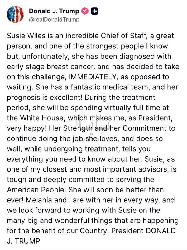 A minor news item Donald J. announced that his chief of staff, Susie Wiles, has been diagnosed with early-stage breast cancer, confirming that she has immediately begun treatment and that the medical prognosis is positive. He added that sh...