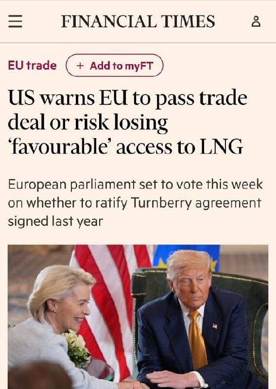 Az #USA figyelmeztette az EU-t: ha Brüsszel késlekedik a kereskedelmi megállapodás jóváhagyásával, vagy megpróbálja megváltoztatni annak feltételeit, Európa elveszítheti az amerikai LNG kedvezményes hozzáférését.