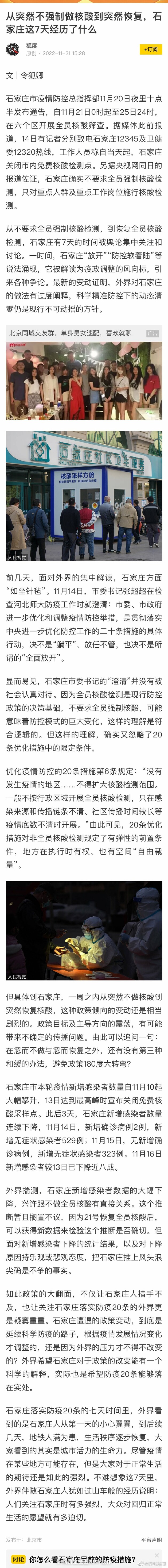 【评论|从突然不强制做核酸到突然恢复 石家庄这7天经历了什么】石家庄市疫情防控总指挥部11月20日夜里十点半发布通告,自11月21日0时起至25日24时,在六个区开展全员核酸筛查。据媒体此前报道,14日有记者分别致电石家庄12345及卫健委12320热线,工作人员称自当天起,石家庄关闭市内免费核酸检测点。从不要求全员强制核酸检测,到恢复全员核酸检测,石家庄有7天的时间被舆论集中关注和讨论。一时间,石家庄“放开”“防控软着陆”等说法涌现,它被解读为疫政调整的风向标,引来各种争论。