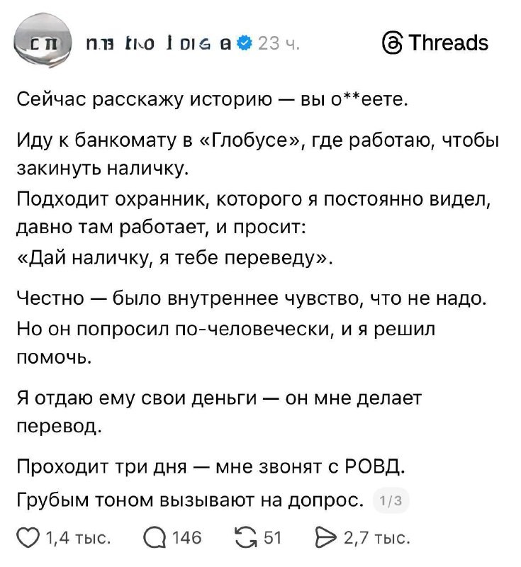 A man wanted to load cash onto his card—and almost got sent away for 7 years. At the ATM, a security guard offered to "help" him by transferring money to his card in exchange for cash. The man agreed. The next day, the police called. The transfer