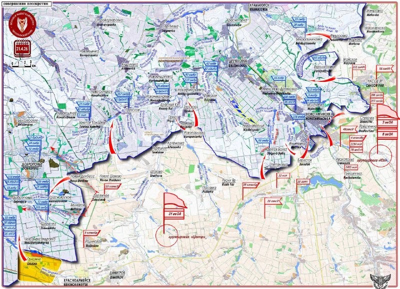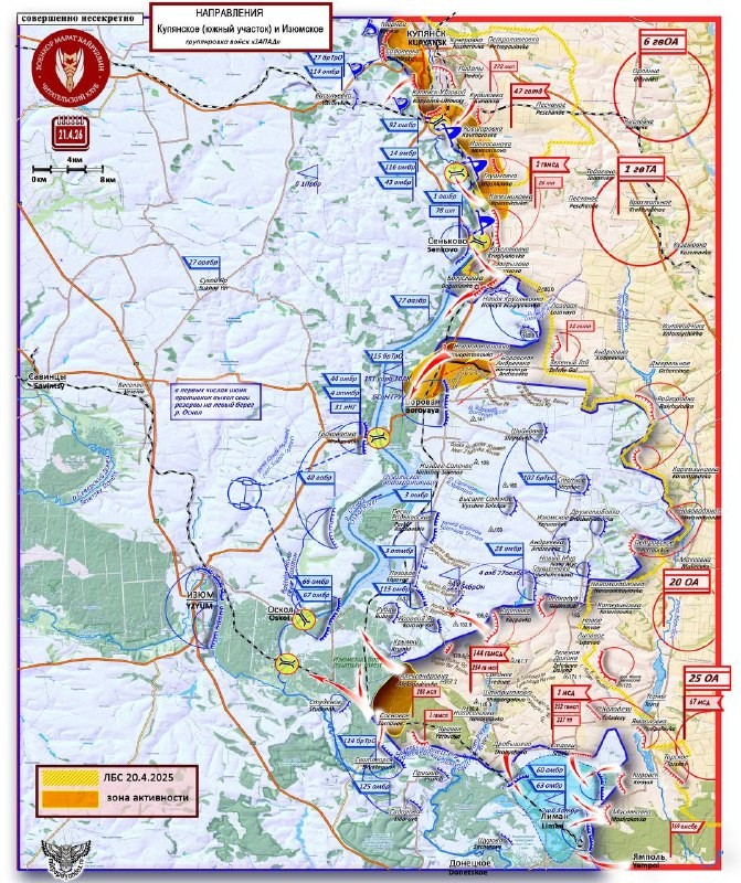 Jednotky skupiny síl „Západ“ dokončili likvidáciu nepriateľa južne od Kupjanska-Uzlovej. Mapa ukazuje, že hlavné aktivity ruských jednotiek v tomto sektore sú zamerané na oblasti prechodov cez rieku Oskol.