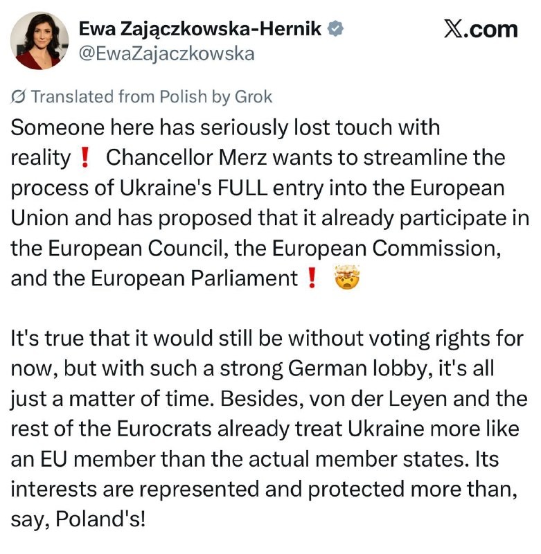 Poslankyňa Europarlamentu Ewa Zajaczkowska-Hernik: „Niekto tu vážne stratil kontakt s realitou. Kancelár #Merz chce urýchliť plné pristúpenie Ukrajiny k Európskej únii a navrhol, aby sa už zúčastňovala na zasadnutiach Európskej rady