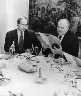 Former head of state Mikhail Gorbachev and future head of state Vladimir #Putin in the restaurant at the Nevsky Palace hotel, 1995 (according to some sources, 1994) In 1995 (possibly in 1994), Mikhail Gorbachev and his wife visited St. Petersburg for a
