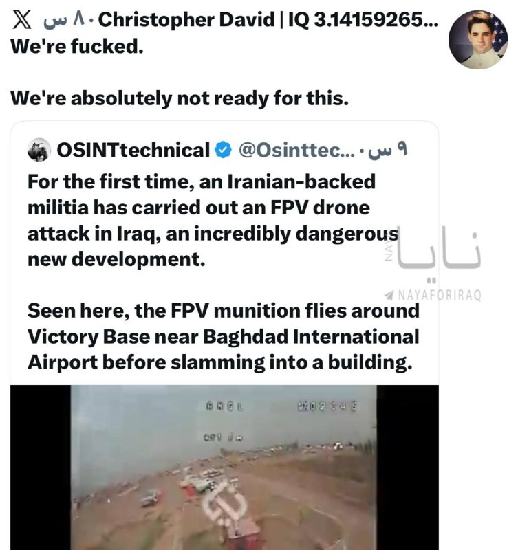 An American soldier comments on videos of the targeting of the Victoria base by drones of the Iraqi resistance. 🌒