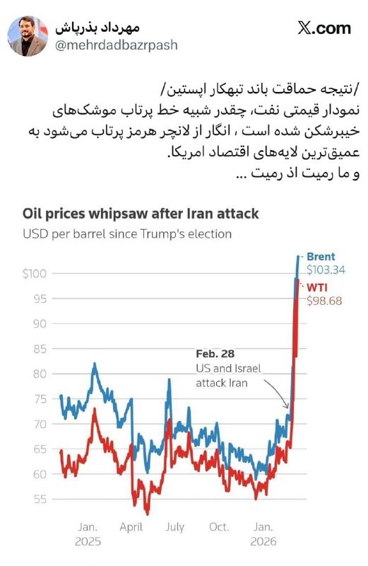 Former Iranian Vice President Bazrpash: The result of the #Epstein crime group's stupidity. The oil price chart has become so similar to the launch line of Iran's missiles.
