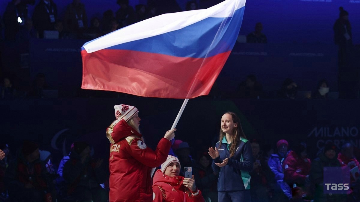 Les athltes russes ont port le drapeau lors de la crmonie de clture des Jeux paralympiques en Italie. Le drapeau paralympique a t remis aux reprsentants franais vu que les prochains Jeux paralympiques auront lieu en #France en 2030.Photo: Mikhal ...