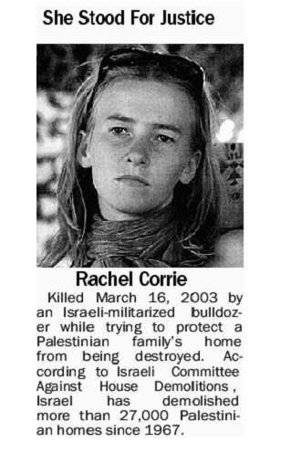 23 years ago, Rachel Corrie was deliberately crushed to death by an Israeli bulldozer in as she tried to protect the demolition of a Palestinian family home.As usual, Zionists got away with murder in broad daylight.We will never forget her ...