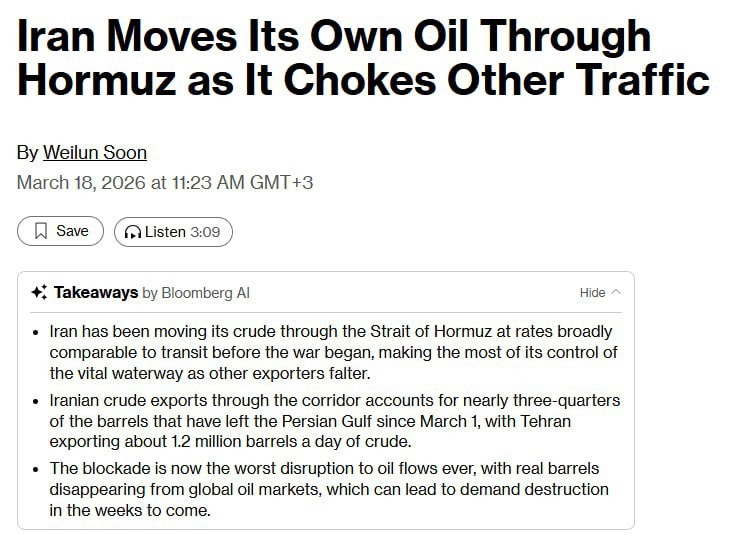 #Iran continues to ship its own oil through the Strait of Hormuz at pre-war rates, according to Bloomberg. Iranian oil exports through the corridor account for nearly 75% of the 27.2 million barrels that have left the Persian Gulf since March 1.