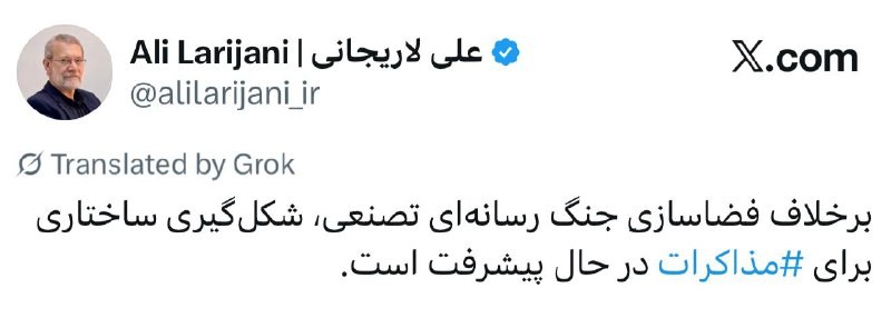 —/ Secretary of Iran's Supreme National Security Council, Ali Larijani: 'Contrary to reports in the media, structural arrangements for negotiations with the U.S. are progressing'