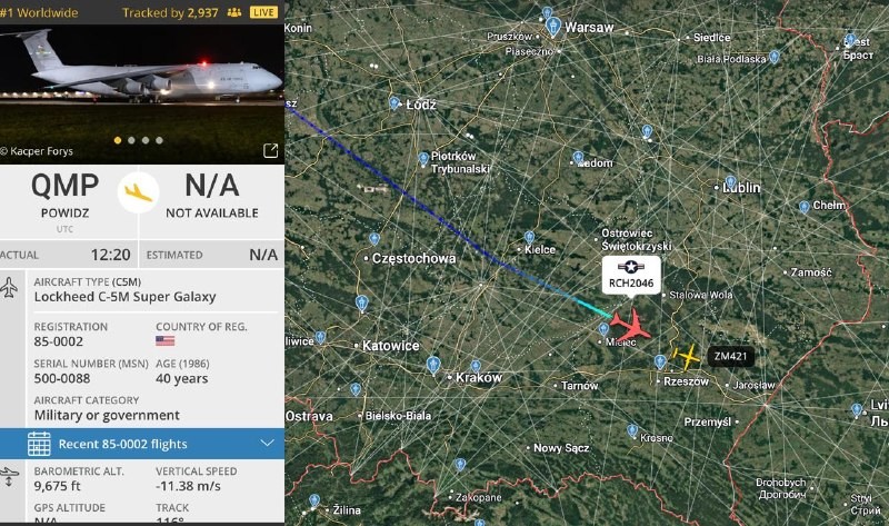 Под прикритието на войната с Иран от полския Повидз от територията на логистичния център на #НАТО в Жешув излита натовареният като баржа свръхтежък транспортен самолет C-5 Galaxy на ВВС на САЩ. В Повидз се намира „желязната планина“ — комплекс