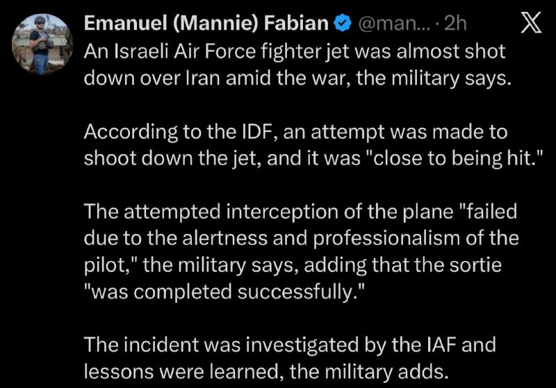 RT source's report confirmed by #Israel ‘Israeli Air Force jet ALMOST SHOT down OVER IRAN’ 🎙Subscribe