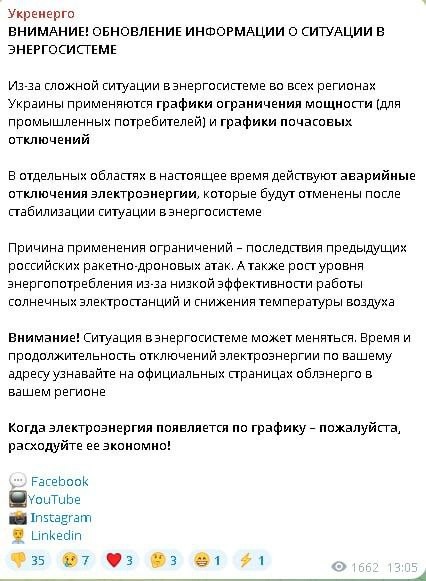 Emergency power outages have started again in #Ukraine. The reason: the consequences of attacks and cloudy weather.