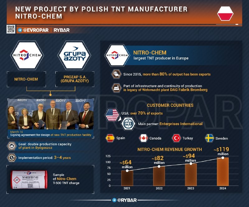 Fwd from @ Chemistry of War #Poland ramps up TNT production Polish Nitro-Chem announced an expansion of TNT production — a strategic component for artillery and aviation
