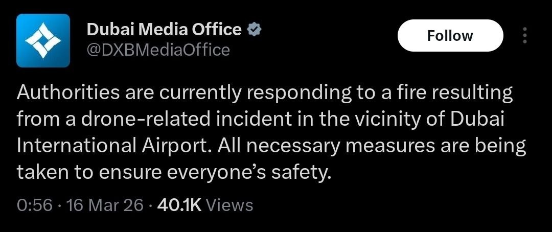 The “drone incident” near Dubai International Airport looks a lot like burning fuel.Also, congratulations to whoever filmed this. You are probably getting arrested.@DDGeopolitics | Socials | Donate | Advertising