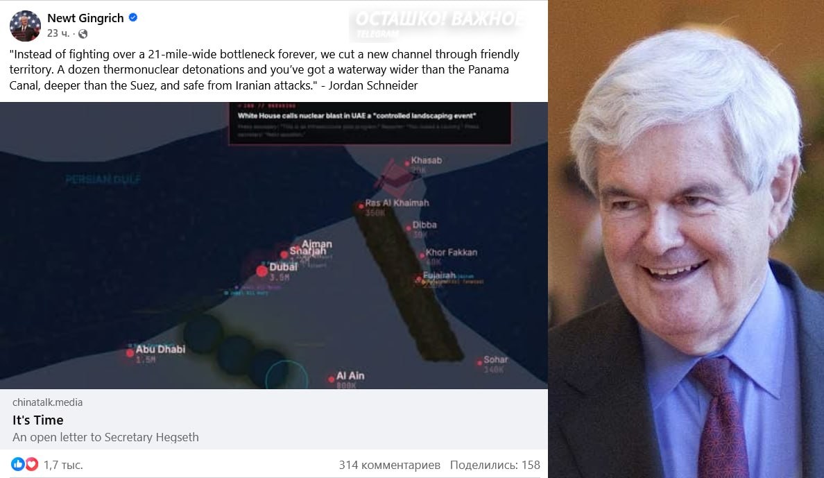 Ex-speaker of the US Congress proposed making a new strait with thermonuclear bombsFormer Speaker of the U.S. House of Representatives Newt Gingrich proposed creating an alternative to the Strait of Hormuz through a series of thermonuclear explos...