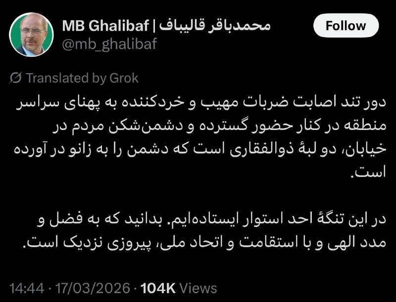 🇮🇷| Iran’s Parliament Speaker, Ghalibaf, says: The presence of Iranians in public supporting the armed forces is one of the two blades of Imam Ali’s Zulfiqar sword. The other blade is the military force. @FotrosResistancee