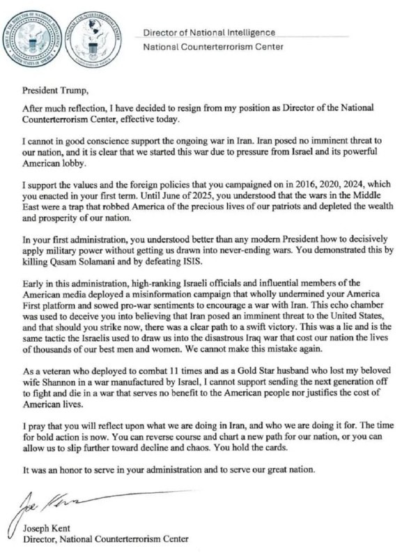 American officials who disagree with Trump's policies are starting to leave their posts: the first to resign was Joe Kent, director of the White House National Counterterrorism Center. Kent claims that his department did not submit any reports to