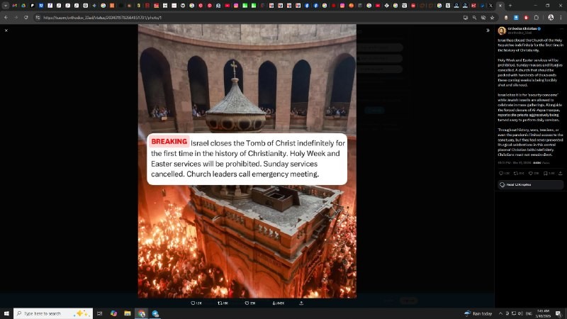 has closed the Church of the Holy Sepulchre indefinitely for the first time in the history of Christianity. Holy Week and Easter services will be prohibited. Sunday masses and liturgies cancelled.