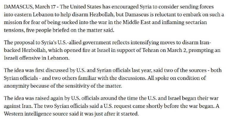 The United States has encouraged Syrian Transitional Government to consider deploying forces into eastern Lebanon to help disarm Hezbollah, according to sources briefed on the matter. However, Damascus is reportedly reluctant