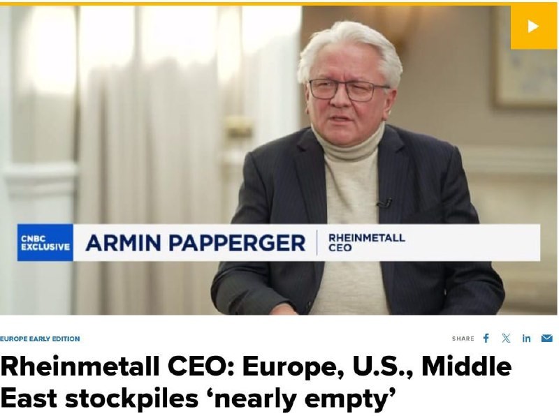 The head of the German defense concern #Rheinmetall, Armin Papperger, stated that global reserves of air defense systems are "practically exhausted" due to the war in the Middle East. Papperger said this in an interview with CNBC.