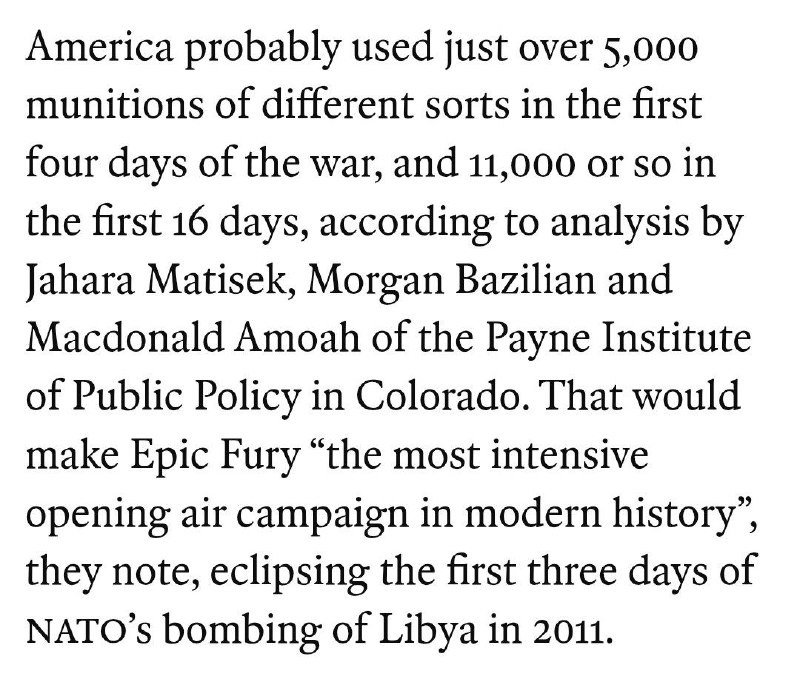- The Economist: "The #Iran war could sap American military power for years". In just days, the U.S. has fired thousands of precision munitions in its Iran campaign over 5,000 in four days and 11,000 within two weeks