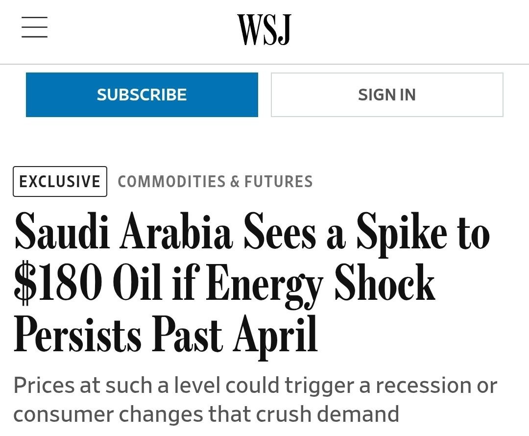 WSJ: Saudi Arabia’s oil officials are working frantically to project how high oil prices might go if the #Iran war and its disruption of energy supplies doesn’t end soon—and they don’t like what they are seeing.The base case