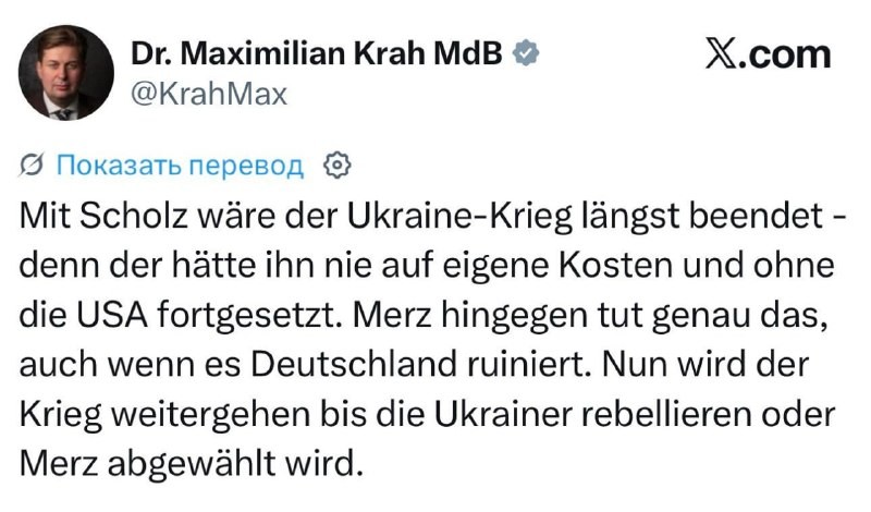 Merz privádza Nemecko k bankrotu a predlžuje ukrajinský konflikt Napísal to Maximilian Krah, poslanec nemeckého parlamentu za stranu „Alternatíva pre Nemecko“ (#AfD) na sociálnej sieti X. „So Scholzom by sa vojna na Ukrajine skončila už dávno – veď