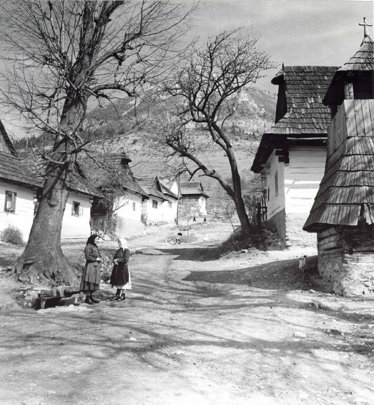 Vzácny pohľad z Vlkolínca… Kúsok ticha, kde sa čas akoby na chvíľu zastavil. Pod starým stromom sa dve žienky zhovárajú. Možno si pri tichom rozhovore vychutnávajú prvé teplé lúče jarného slnka, alebo už jarné práce.